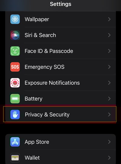 Khởi chạy cài đặt của iPhone. Cuộn xuống và Đi tới Quyền riêng tư và Bảo mật.