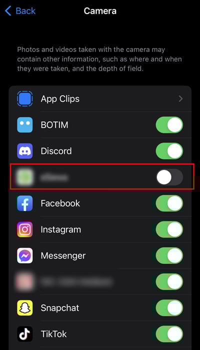 Bây giờ, bạn sẽ thấy tất cả ứng dụng mà có quyền truy cập vào Máy ảnh của bạn. Bạn có thể Tắt ứng dụng để ngừng truy cập quyền của máy ảnh.