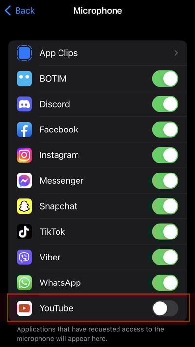 Bây giờ, bạn sẽ tìm thấy tất cả ứng dụng mà có quyền truy cập vào máy ảnh của bạn. Bạn có thể Tắt từng ứng dụng để ngăn chúng truy cập vào micrô.