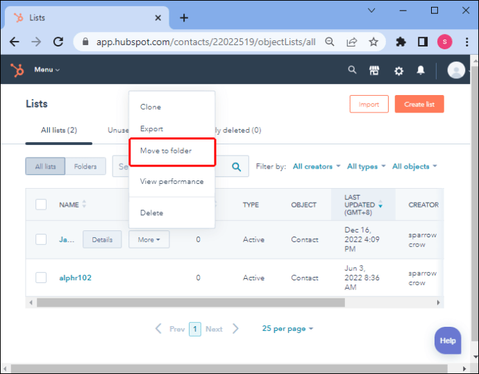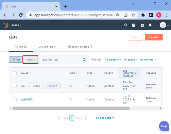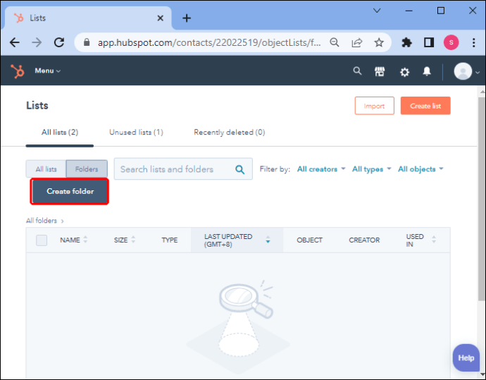 Để giúp tổ chức, tất cả người dùng HubSpot có thể tạo thư mục cho danh sách của họ. Mặc dù không cần thiết nhưng nó sẽ giúp người khác tìm thấy các danh sách cụ thể một cách nhanh chóng. Sau đây là cách tạo thư mục danh sách: