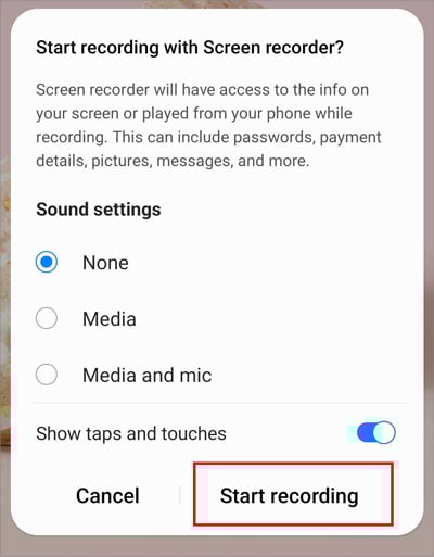 Trước khi bắt đầu quay, bạn sẽ thấy các tùy chọn liên quan đến cài đặt âm thanh. Không có: Chọn Không có nếu bạn không muốn có bất kỳ âm thanh nào. Phương tiện: Chọn Phương tiện nếu bạn chỉ muốn ghi âm thanh tích hợp. Phương tiện và Micrô: Chọn các tùy chọn này nếu bạn muốn ghi lại giọng nói của mình và âm thanh phương tiện tích hợp. Hiển thị các lần chạm và chạm: Bật tính năng này nếu bạn muốn hiển thị những gì bạn đã chạm và chạm trên màn hình. Chạm vào Bắt đầu ghi âm và nó sẽ bắt đầu đếm ngược đến ba và sẽ bắt đầu ghi âm sau đó. Bạn cũng có thể bỏ qua đếm ngược bằng cách nhấn vào Bỏ qua đếm ngược.