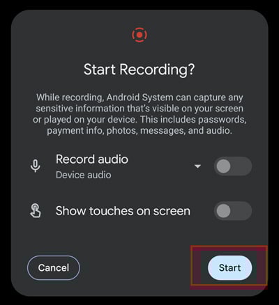 Trước khi bạn bắt đầu ghi, bạn sẽ thấy hai tùy chọn. Ghi âm thanh: Nhấn vào âm thanh đã ghi và nó có tùy chọn chỉ ghi âm thanh từ thiết bị, micrô hoặc cả hai. Hiển thị các lần chạm trên màn hình: Nó sẽ hiển thị khu vực vòng tròn mà bạn đã chạm. Chạm vào Bắt đầu và nó sẽ bắt đầu đếm ngược đến 3 và sẽ bắt đầu ghi âm sau đó.