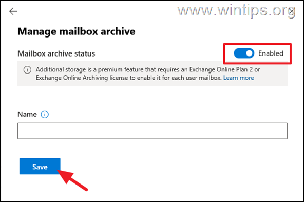 3. Tại đây, đặt Quản lý kho lưu trữ hộp thư thành Đã bật và nhấp vào Lưu. Sau đó, tiếp tục đến bước 2 bên dưới.