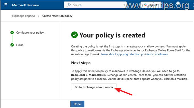 4. Ở giai đoạn này, bạn đã hoàn tất việc tạo chính sách lưu giữ mới. Bước tiếp theo là gán chính sách mới cho hộp thư của người dùng mong muốn thông qua trung tâm quản trị Exchange. Để thực hiện việc này ngay lập tức, hãy điều hướng tới Trung tâm quản trị Exchange và làm theo hướng dẫn ở bước tiếp theo.